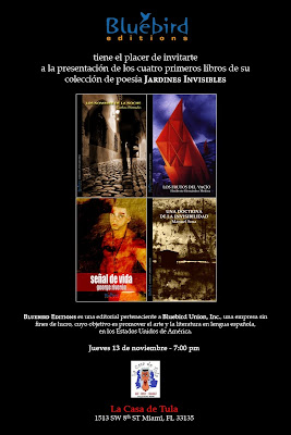 Nota: Estos libros podrán adquirirse los días 14, 15 y 16 de Noviembre, durante la XXV Feria Internacional del Libro de Miami en el stand de Bluebird Editions (Stand 346 E. 3th ST entre NE 1st Ave and NE 2nd Ave.) Aquí, detalles sobre los libros.