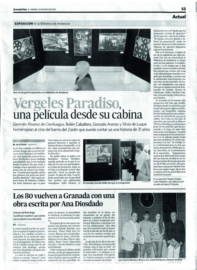 Mi amigo Raúl Ciro —de quien he escrito aquí, y cuyas canciones tarareo a mi niño cuando se va a dormir y cuando se despierta— dio un concierto la semana pasada en Granada, su tierra adoptiva. El motivo fue un proyecto multi-disciplinario titulado “Vergeles Paradiso: cuatro fotógrafos y una cabina de cine” que el propio Ciro capitanea y que tiene su cuartel general en Cinemas Los Vergeles, recinto que ha deleitado durante tres décadas a los vecinos del barrio granadino del Zaidín.