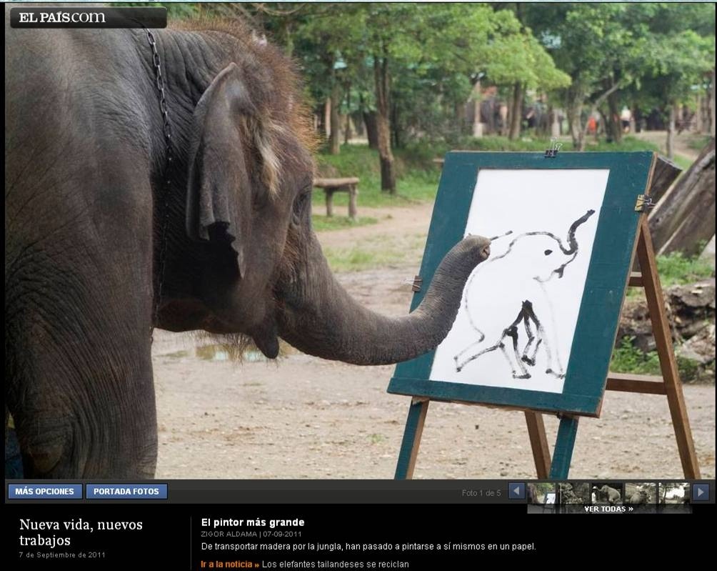 La foto ha sido publicada en El País. Y supongo que todos los que la ven se quedan azorados con el elefante que, con pincel de brocha fina, se retrata a sí mismo o a alguno de sus congéneres. A mí también me saltan a la vista las dotes artísticas del paquidermo. Qué pulso, qué trazo, qué definición en la línea que apenas se interrumpe. Pero, ay, el punto de fuga en el que se pierde mi mirada es la cadena que le rodea el pescuezo al animal. Al margen de la evidencia, el elefante se percibe libre: la cadena no aparece reflejada en el retrato.
