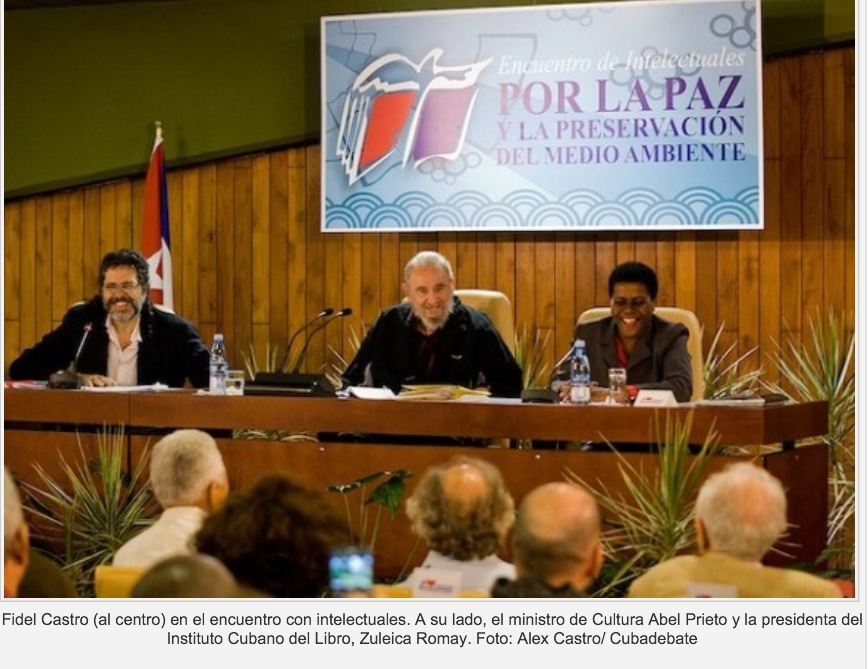 A propósito de un “diálogo” que duró más de nueve horas entre esa metástasis que es Fidel Castro y un cúmulo de posibles pacientes de la Liga Contra la Ceguera, el sitio CubaDebate —notable por escribir “presidente” donde va “dictador” y otras infamias similares— regala una foto curiosa. Curiosa porque muestra al susodicho compartiendo panel con un pelilargo y una negra —no relean, escribí “negra”—, pero curiosa también por la leyenda que complementa la imagen. En la instantánea, sentado entre el “ministro de cultura” y una señora con quien comparto apellido —pero no parentesco—, aparece el nefasto personaje, esta vez sin el uniforme que lo hiciera reconocible durante décadas o el más reciente chandal ADIDAS con la bandera cubana y el nombre del portador. Llama la atención que los editores del sitio más entusiasta de esa tiranía tengan que especificar cuál de los tres panelistas es el que ha sembrado el luto en la isla durante medio siglo. Como si uno no se supiera esa odiosa cara de memoria. O es acaso porque entre tantas sandeces repetidas, tanto rictus, tantas muecas y tanta cámara hiperbárica ya ni sus acólitos sean capaces de reconocerlo.