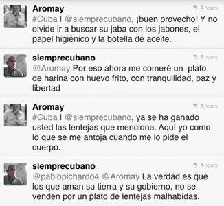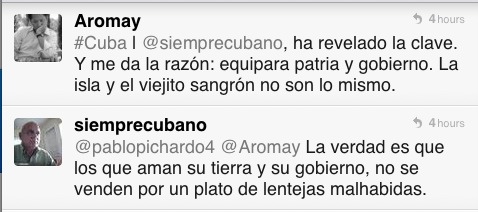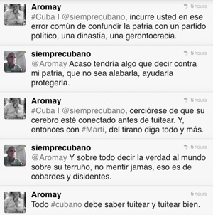 A propósito de ese propósito, hoy tuve un intercambio muy divertido con un castrista de esos que hay por ahí. Ya que los lectores del blog no son necesariamente tuiteros y viceversa, acá les dejo unos pantallazos de lo que nos dijimos en 140 caracteres.