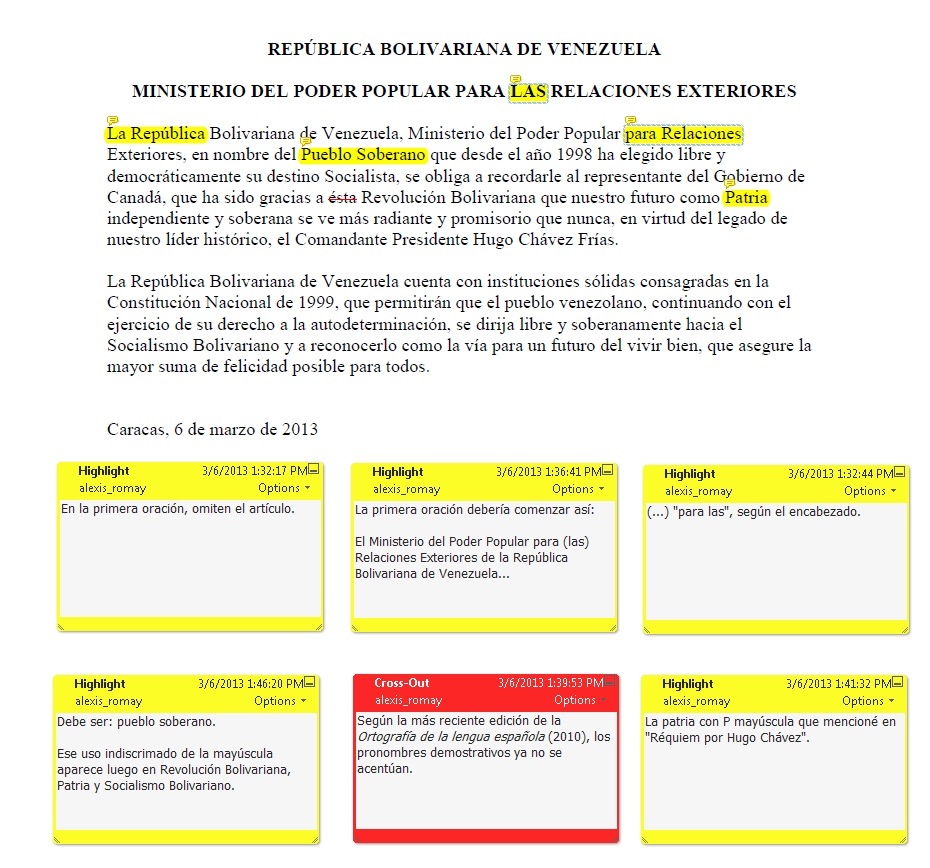 Durante mi hora de almuerzo, que hoy transcurrió frente al teclado, me dio por corregir las pifias de ortografía y redacción del comunicado bolivariano. Mis comentarios y correcciones siguen debajo del texto, en orden de aparición.