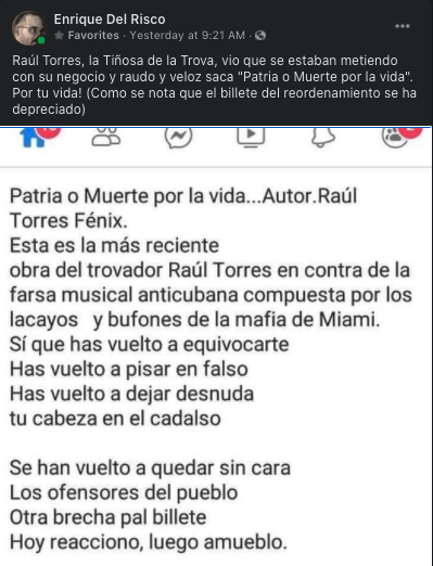 El pie forzado me lo dio Enrique Del Risco, que publicó este pantallazo del muro del susodicho. (La canción es más larga y más infame. Por tanto, les ahorro el resto).