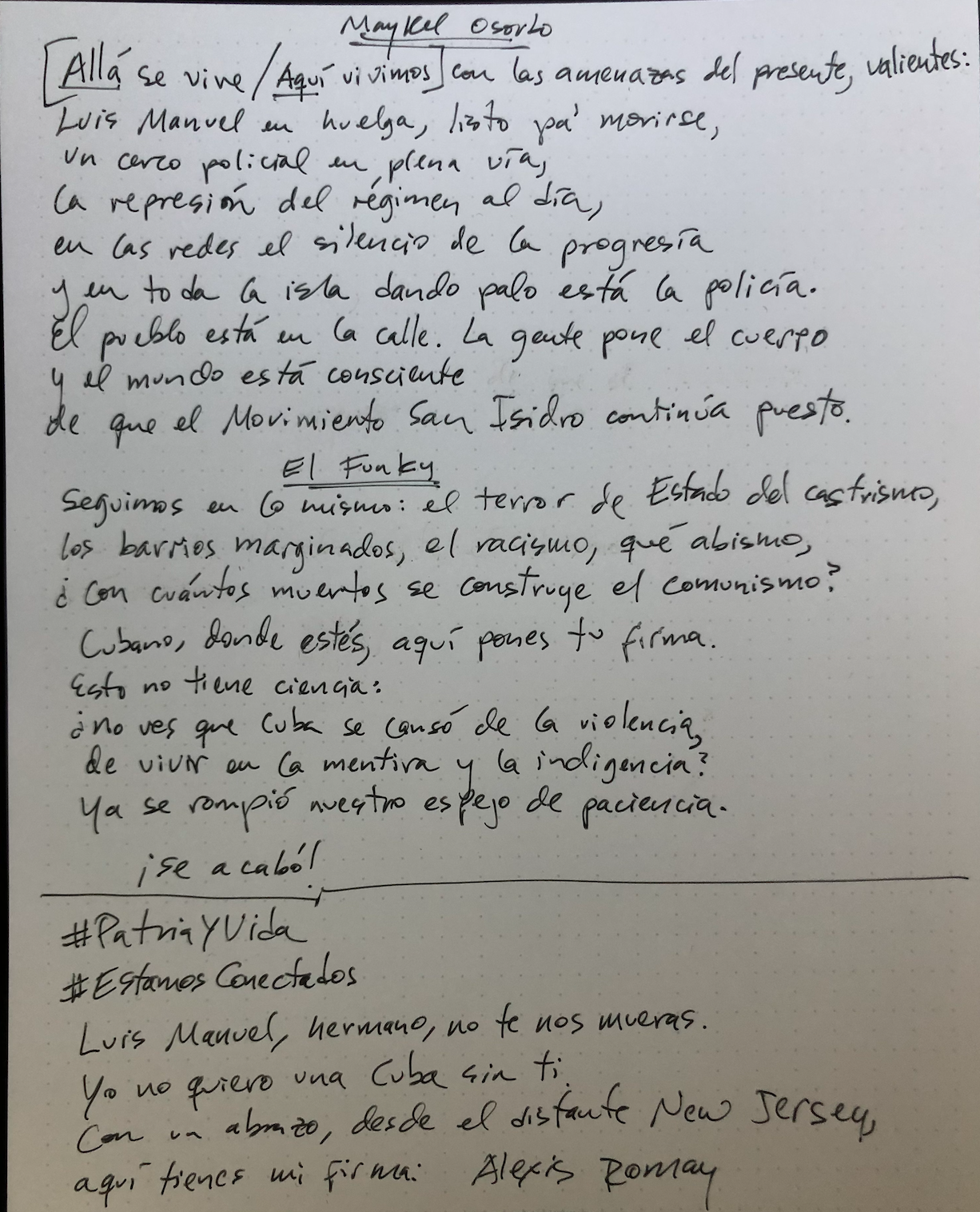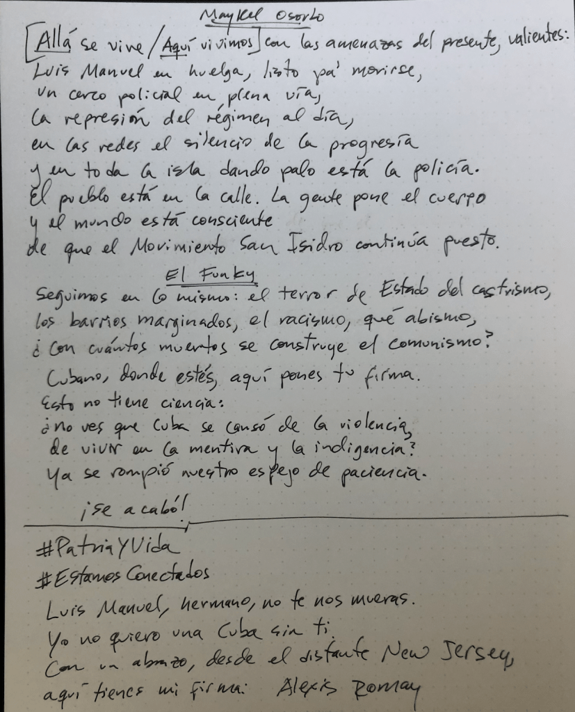 Entonces recordé que en la canción —que se ha convertido, con todo derecho, en himno—, Maykel Osorbo dice: “Aquí vivimos con la incertidumbre del pasado”. Y pensé que, además de la ubicuidad del monolito oficial de la Historia, en Cuba se vive con las amenazas del presente. Entonces me tomé la libertad de actualizar —ay, desde Nueva Jersey— lo que cuentan Maykel Castillo y El Funky. Respeté la métrica en todo momento y, siempre que pude, las rimas consonantes y asonantes. Dejé intactos unos versos.