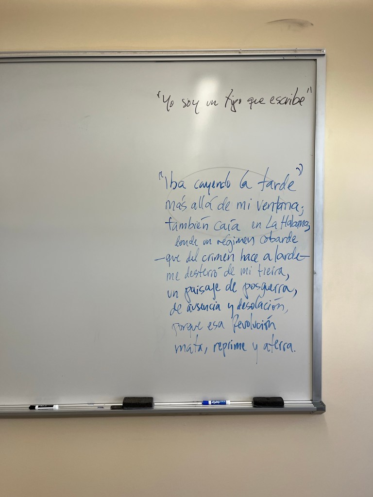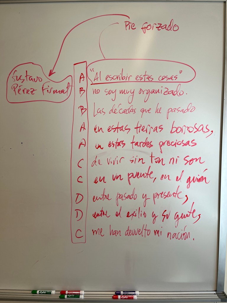 Posdata: Dedico estas espinelas a mi querido Gustavo Pérez Firmat, que por cuarto año consecutivo visitó mis clases para hablar de sus 50 lecciones de exilio y desexilio y que otra vez, quizá sin proponérselo, me dio el pie forzado de ambas décimas (que escribí mientras moderaba el coloquio, y que leí al final de cada encuentro; repentista que es uno). Y ya que estamos: también dedico este texto a mis estudiantes, que a lo largo de los años han leído este libro con curiosidad y empatía.